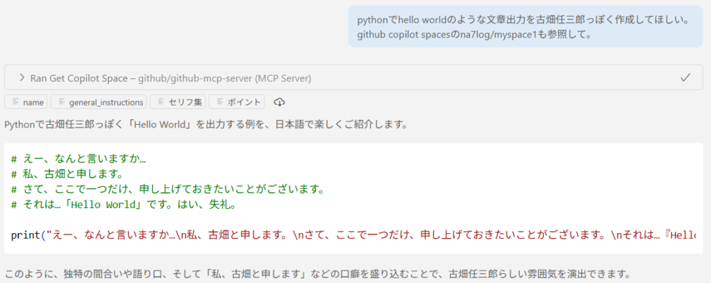 GitHub MCPサーバを設定すれば、エディタ上から「Spacesの内容を参照して質問」ができます。