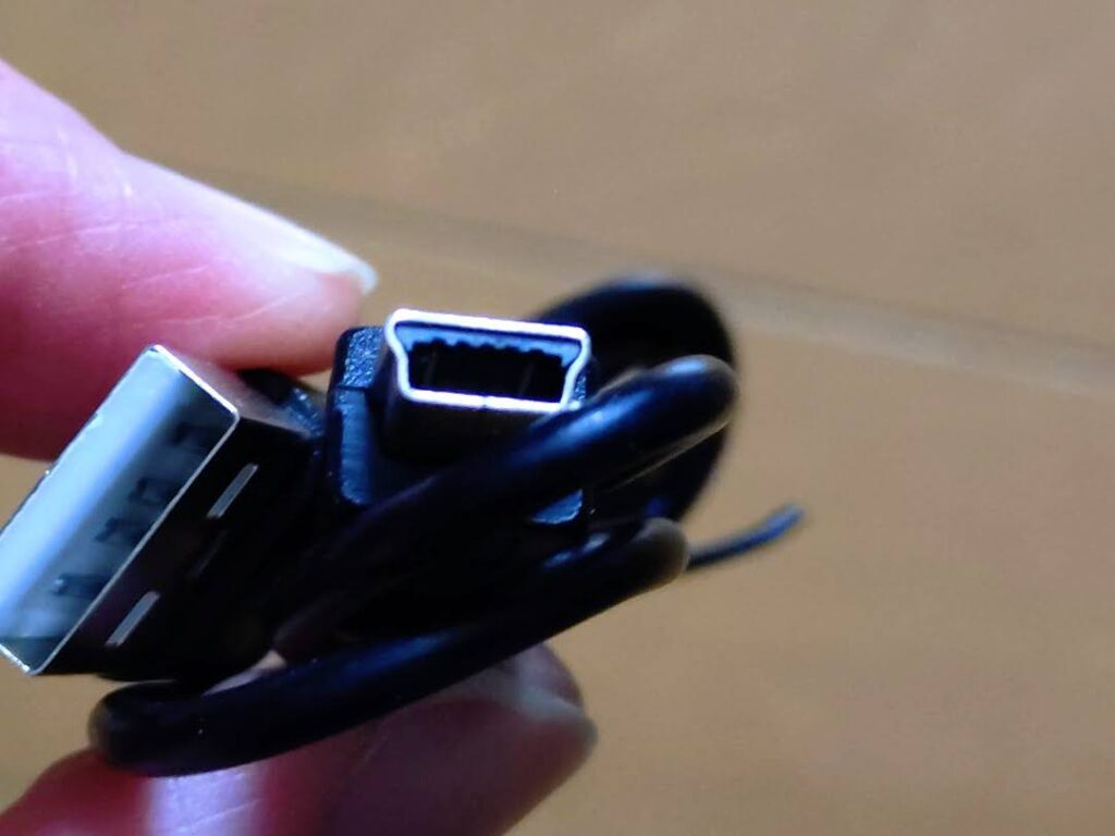 充電ケーブルの端子は少し懐かしいMini型 USB端子(Microですらない)。